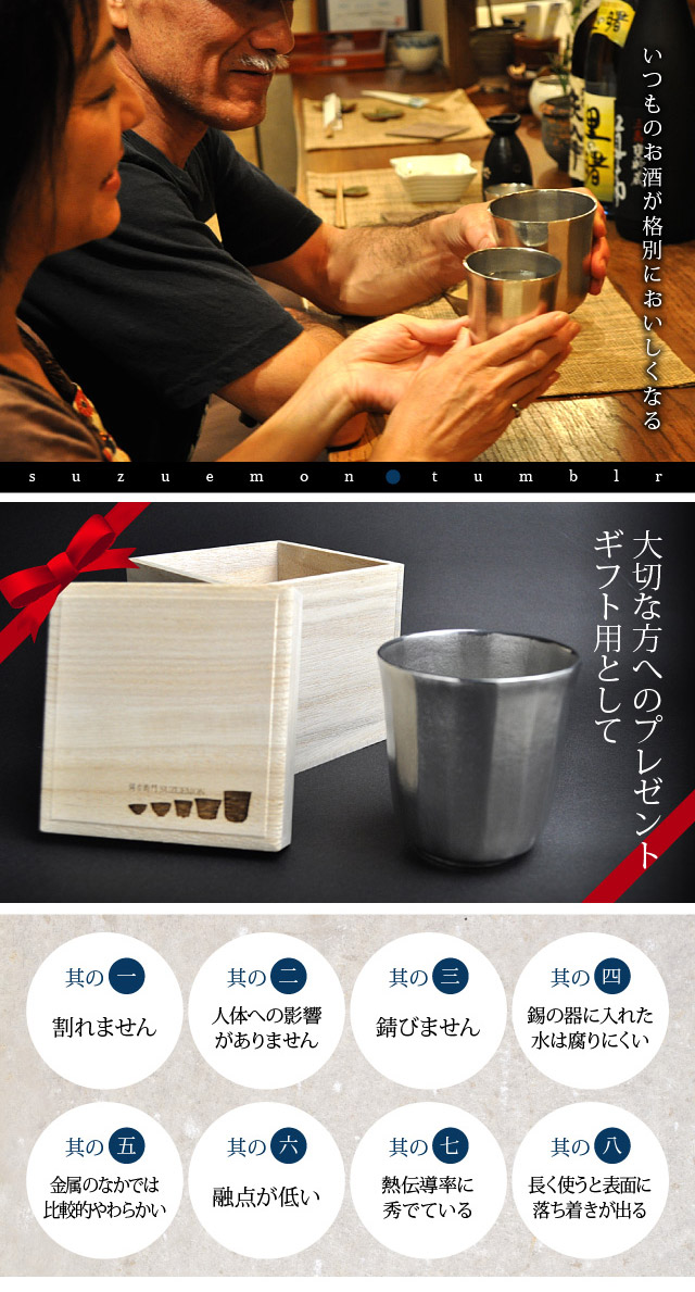 錫右衛門では、贈り物・ギフト用としてご利用いただく際に、お贈りするお客様の気持ちまでもお届けしたいという思いから「錫右衛門特製 桐箱」「錫右衛門特製 メッセージカード」(いずれも有料)を各種ご用意しています。